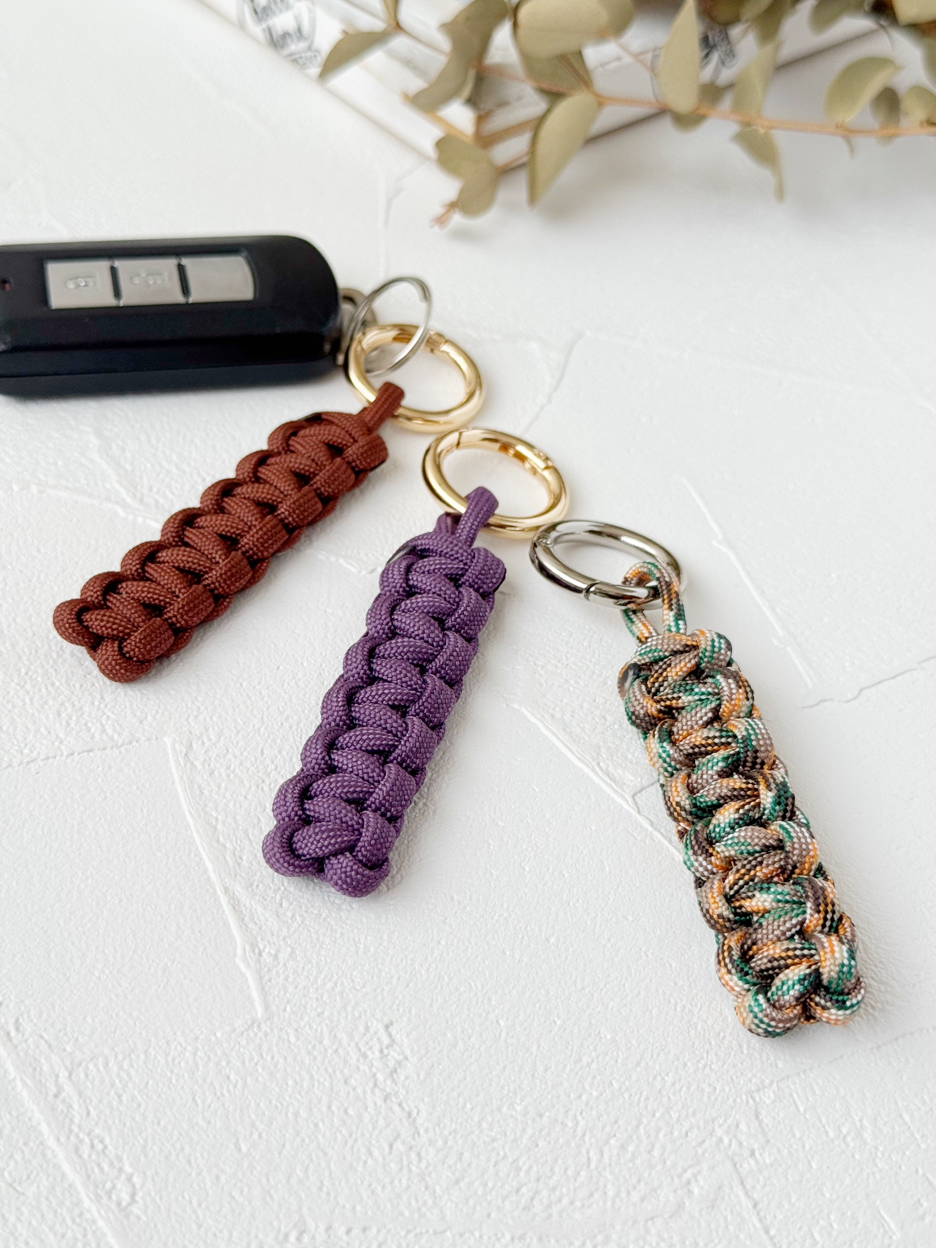 「マクラメはじめてさん」にもぴったりな、超カンタンなクラフトコードで結ぶキーホルダーの手作りキットです。