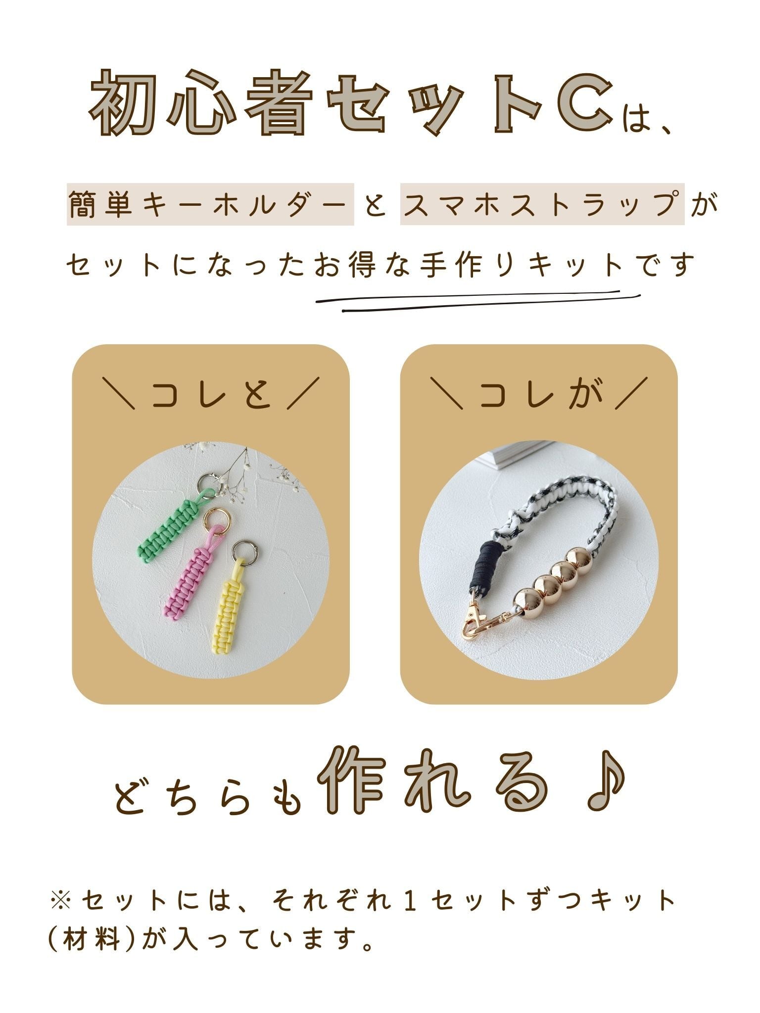 「マクラメはじめてさん」にもぴったりな、【簡単キーホルダー】と【スマホストラップ】の手作りキットのセット販売です♪